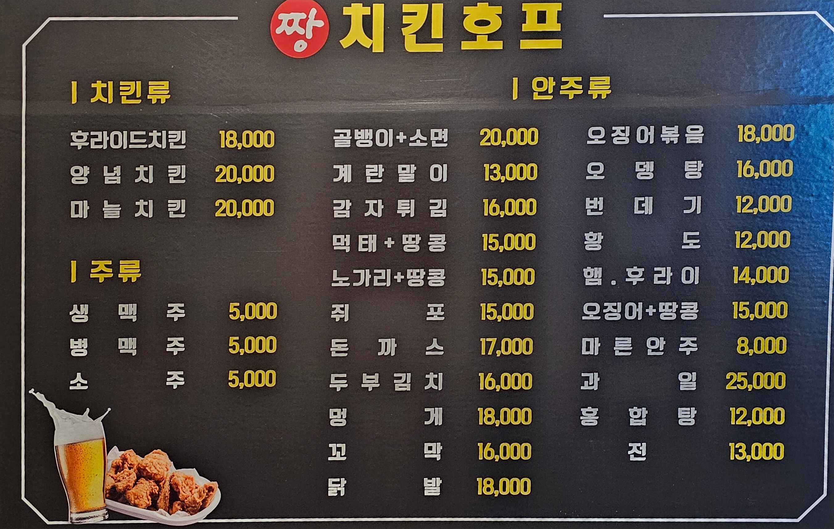 양념&후라이드 반반 16,000 | 후라이드치킨 15,000 | 뺘닭발 13,000 | 뼈없는닭발 15,000 | 골뱅이무침 5,000