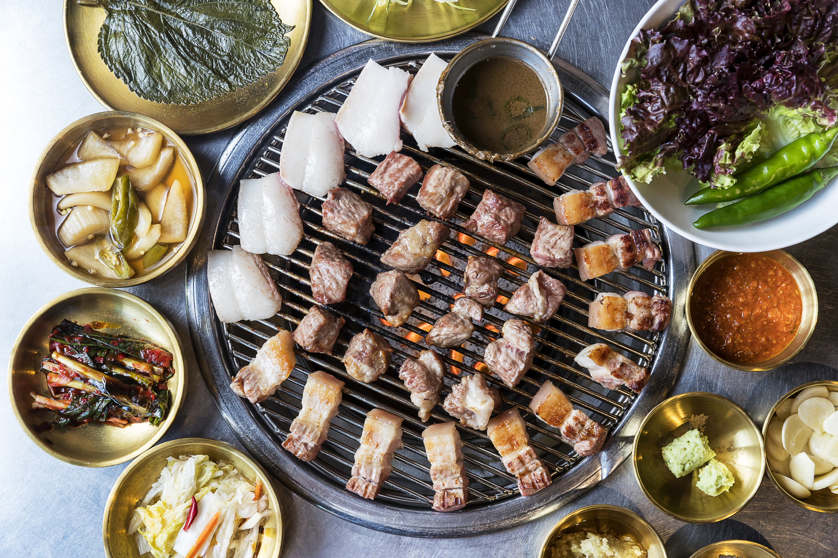 특목살 16,000 | 미삼겹 17,000 | 등심덧살 16,000 | 토시살 20,000 | 본갈비 22,000 | 고공세트 89,000 | 돼지세트 34,000 | 소세트 39,000 | 치마육회 20,000 | 양념껍데기 9,000 | 된장찌개 6,000 | 김치찌개 6,000 | 쫄냉면 6,000 | 버섯구이(2개) 3,000 | 공깃밥 1,000 | 하우스와인 6,000 | 연태/ 얼그레이/ 유자 하이볼 8,000