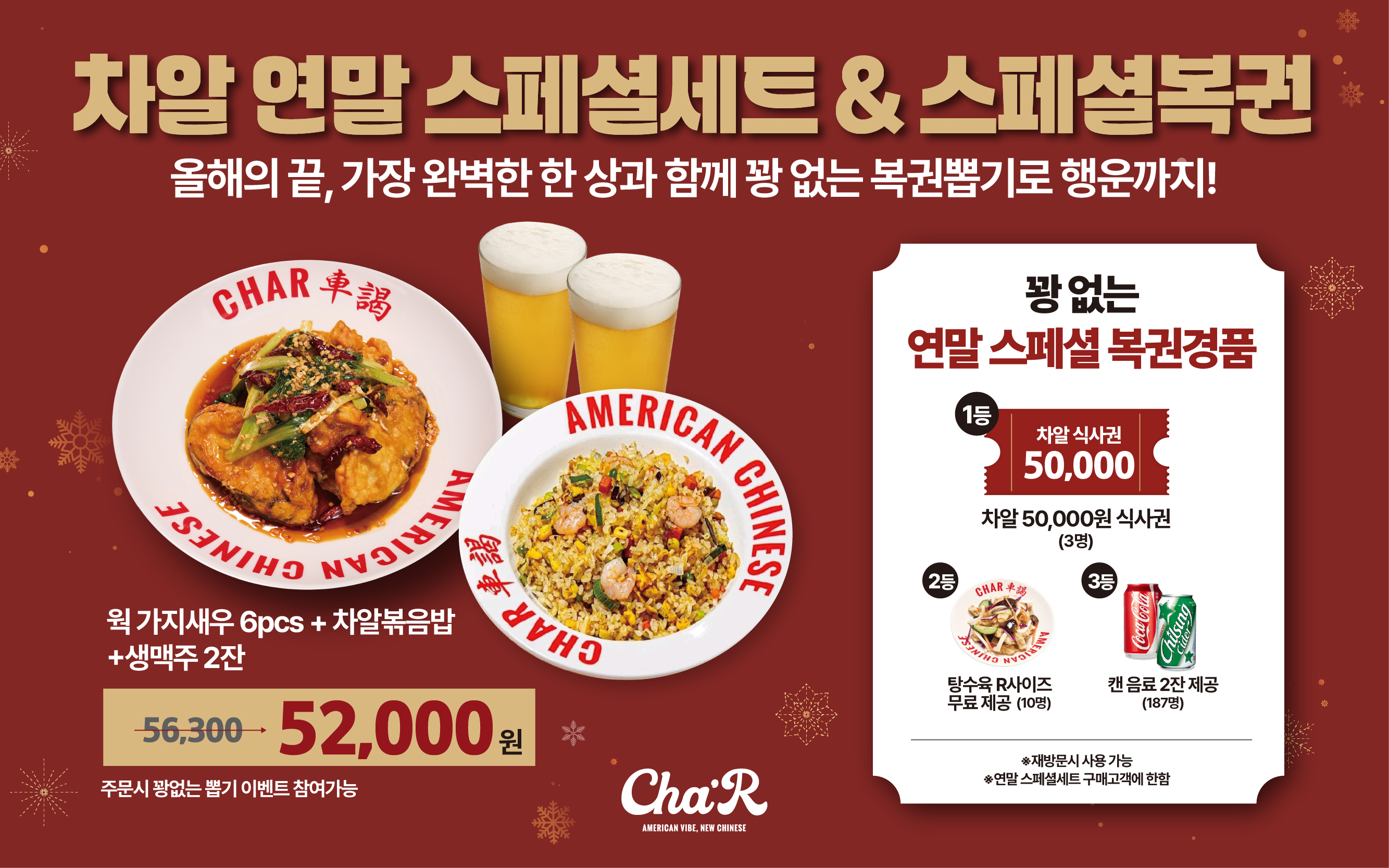 웍 가지새우 27,500 | 레몬크림 쉬림프 25,500 | 칠리 쉬림프 25,500 | 상하이 로포크 39,000 | 제네럴 쏘 치킨 22,500 | 오렌지 치킨 23,500 | 차알 유린기 26,900 | 차알 탕수육 23,900 | 씨푸드 앤 랍스터 소스 40,000 | 씨푸드 앤 스파이시 소스(팔보채) 49,000 | 차알 마라샹궈 31,900 | 몽골리안 비프 32,000 | 고추잡채 29,000 | 차알 볶음밥 12,000 | 차알 마라탕면 14,900 | 차알 탄탄면 12,500 | 차알 삼선짬뽕 14,900 | 차알 백짬뽕 13,500 | 투움바 차우멘 16,000 | 차우멘 14,900 | 사천 볶음짜장 13,500 | 해산물 덮밥 17,500 | 차알 짬뽕탕 28,000 | 테라 생맥주 7,000 | 칭타오 생맥주 9,000 | Bottle 하얼빈 500ml 9,500 | 참이슬 후레쉬 5,000 | 진로 5,000