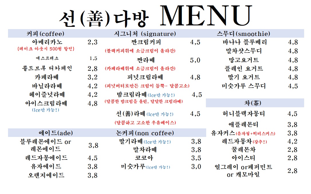 플레인요거트 스무디 4,800 | HOT 유자커스 3,800 | HOT 허니블랙자몽티 4,500 | 유자커스 3,800 | 허니블랙자몽티 4,500 | 레드자몽에이드 4,500 | 블루레몬에이드 3,800 | HOT 피넛크림라떼 4,800 | 피넛크림라떼 4,800 | 밤크림라떼 4,500 | TAKE OUT 아메리카노 1,800 | 콜드부루 디카페인 2,800 | 카페라떼 3,200 | 바닐라라떼 4,200 | 헤이즐넛라떼 4,200 | 아이스크림라떼 4,800 | 짠 크림커피 4,500 | 선라떼 4,500 | 피넛크림라떼 4,800 | 레드자몽에이드 4,500 | 꿀레몬차 2,800 | 코코아 3,500 | 짠 라떼 5,000 | HOT 레드자몽차 4,200 | 레드자몽차 2,800 | 말차샷스무디 4,500 | HOT 코코아 3,500 | 레몬에이드 3,800 | 허브차 2,800 | 미숫가루스무디 4,500 | ICE 미숫가루 3,000 | HOT 허브차 2,800 | HOT 페퍼민트 2,800 | HOT 얼그레이 2,800 | HOT 꿀레몬차 2,800 | HOT 유자차 2,800 | HOT 애플레몬티 3,800 | HOT 말차라떼 3,800 | HOT 짠크림커피 4,500 | HOT 헤이즐넛라떼 4,200 | HOT 바닐라라떼 4,200 | HOT 카페라떼 3,200 | HOT 콜드브루디카페인 2,500 | HOT 아메리카노 2,300 | 브라우니 2,800 | 소금빵 2,200 | 유자차 2,800 | 망고요거트스무디 4,800 | 베이글 샌드위치 4,900 | 크루아상 2,200 | 치아바타 5,500 | 파운드케이크 3,500 | 베이글 2,200 | 에그타르트 3,000 | 딸기바나나스무디 4,800 | 말차라떼 3,800 | 아이스티 2,800 | 얼그레이 2,800 | 페퍼민트 2,800 | 복숭아에이드 3,800 | 복숭아라떼 3,800 | 딸기 요거트 스무디 4,800 | 티라미수 3,800 | 애플레몬티 3,800 | 딸기라떼 3,800 | 바나나 블루베리 스무디 4,800