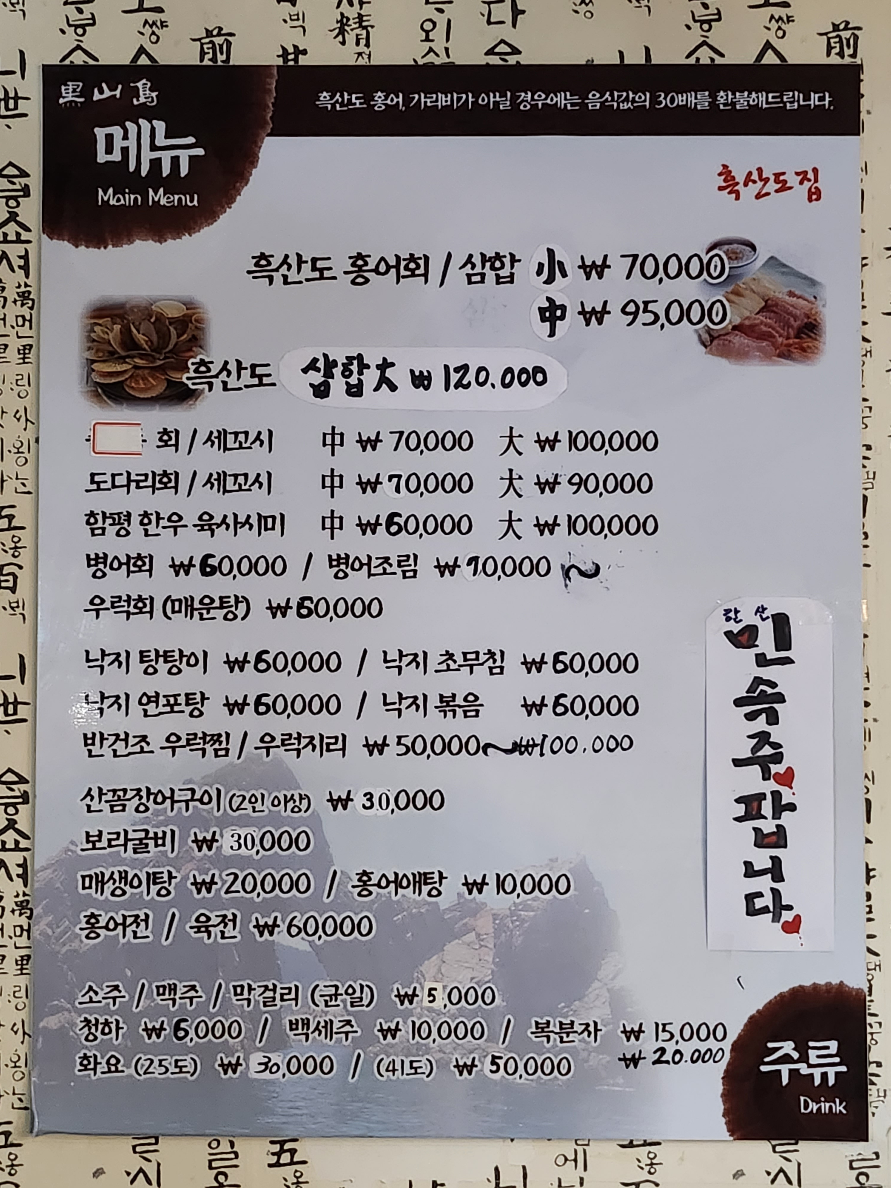 홍어회 삼합(소) 70,000 | 홍어회 삼합(중) 95,000 | 흑산도 삼합(대) 120,000 | 도다리 세꼬시(중) 70,000 | 도다리 세꼬시(대) 90,000 | 우럭회(매운탕) 60,000 | 병어회 60,000 | 병어조림 70,000 | 반건조 우럭찜/우럭지리 변동가격(업주문의) | 한우 육사시미(중) 60,000 | 한우 육사시미(대) 100,000 | 홍어전/육전 60,000 | 낙지 탕탕이 60,000 | 낙지 초무침 60,000 | 낙지 연포탕 60,000 | 낙지 볶음 60,000 | 낙지 숙회 60,000 | 산꼼장어구이 30,000 | 보리굴비 30,000 | 매생이탕 20,000 | 홍어애탕 10,000 | 맥주 5,000 | 소주 5,000 | 막걸리 5,000 | 청하 6,000 | 백세주 10,000 | 복분자주 20,000 | 화요25도 30,000 | 화요41도 50,000