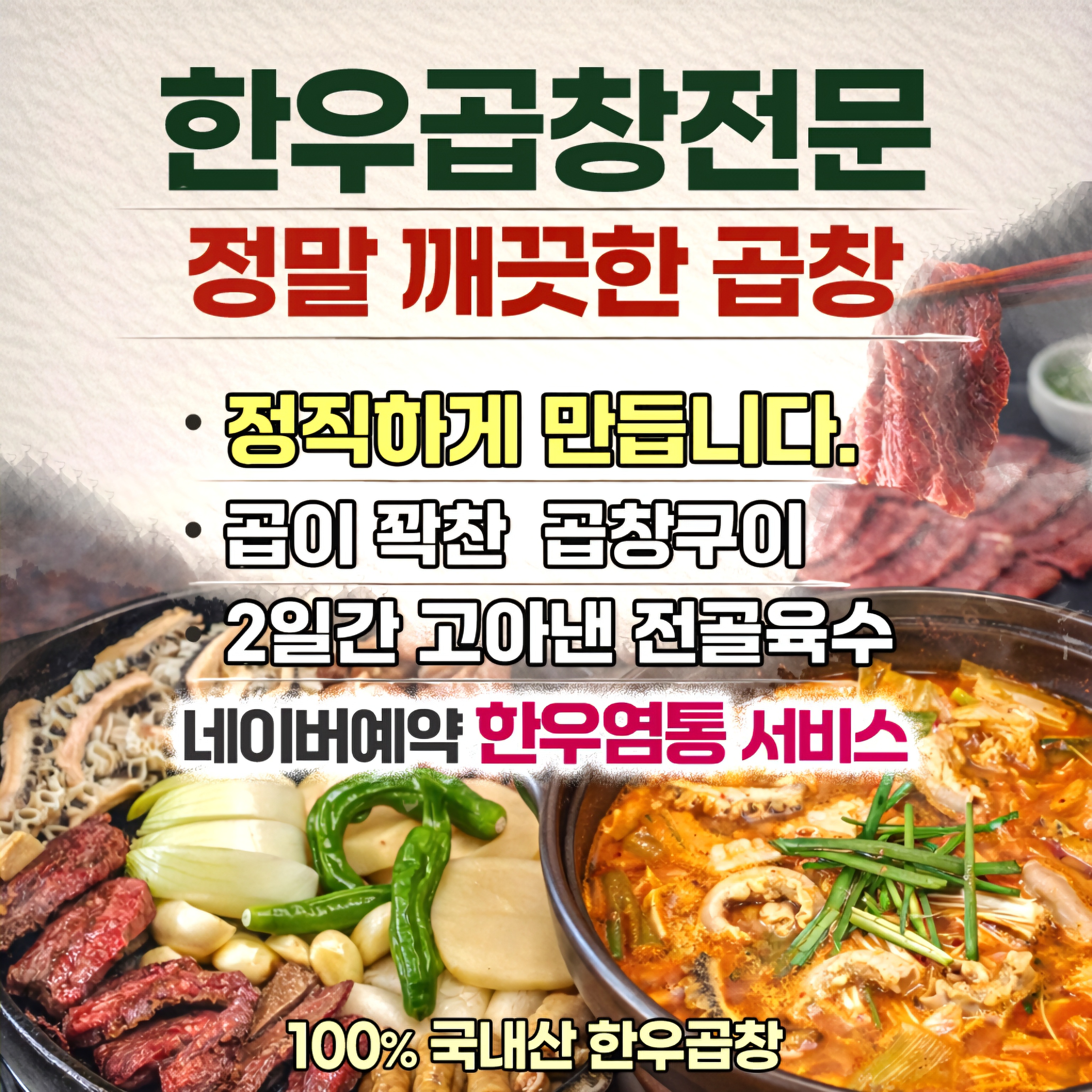 🔸한우염통(네이버예약) 0 | ❤️한우모듬구이❤️ 55,000 | 💚한우곱창구이💚 26,000 | 🧡한우양깃머리🧡 29,000 | 🥓한우차돌박이🥓 25,000 | 💙한우막창구이💙 26,000 | 💝한우염통구이💝 17,000 | 💛한우벌집양💛 17,000 | 🔸한우사시미 (한정판매) 29,000 | 🍲한우곱창전골🍲 22,000 | 🍚볶음밥 3,000 | 🔥얼큰열라면 5,900